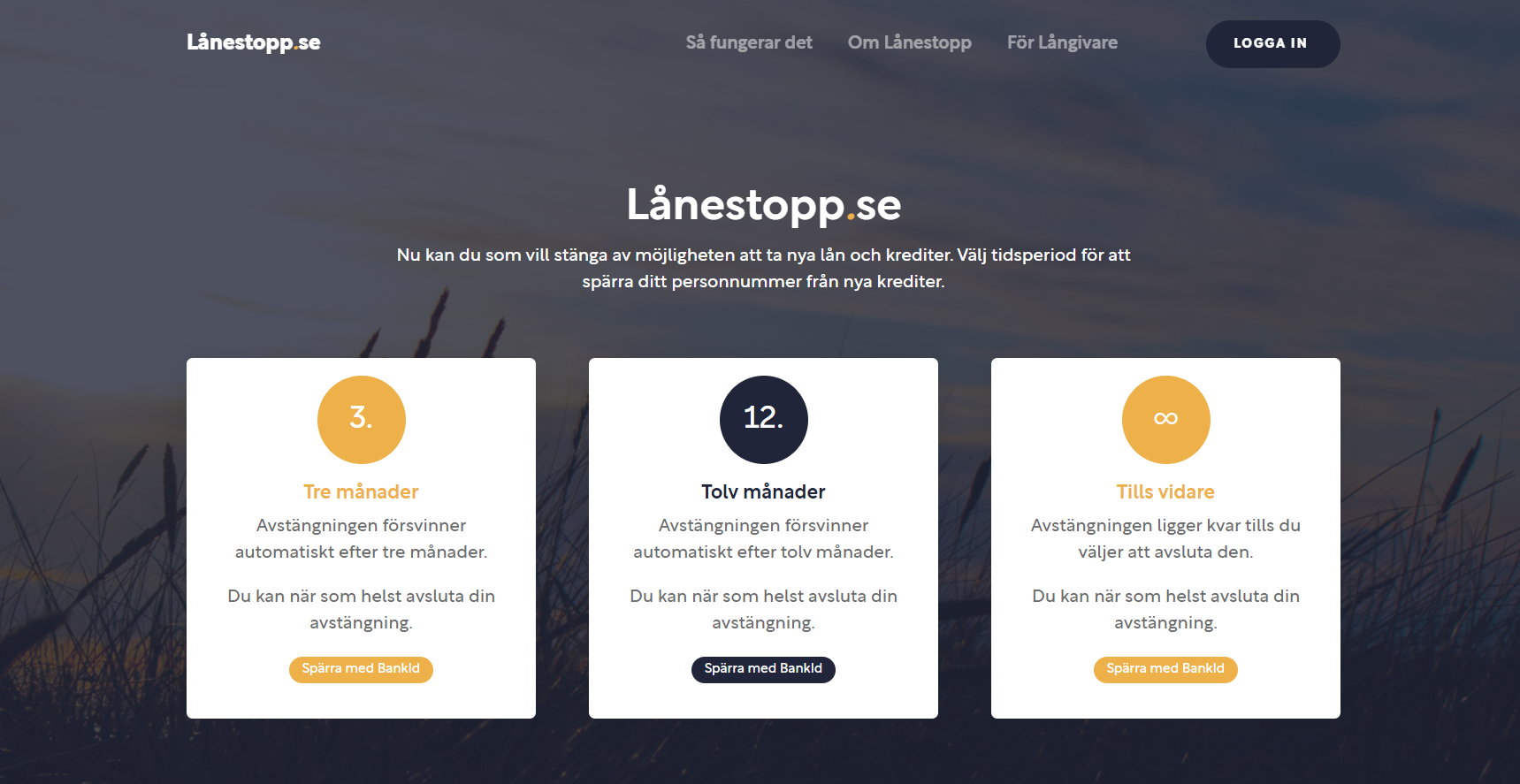 Här stänger du av dig från att ta nya lån och krediter. Välj tidsperiod nedan och verifiera dig med BankID. En avstängning i Lånestopp.se går inte att ångra eller avsluta i förtid.